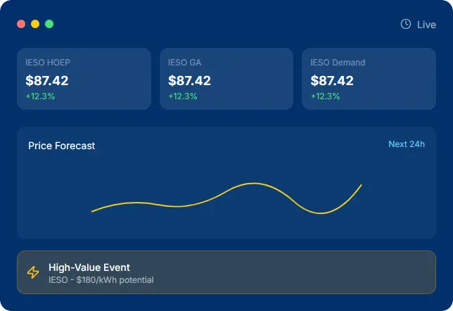 Access live pricing signals, grid conditions, and demand forecasts for the Ontario IESO market. Never miss a revenue opportunity.